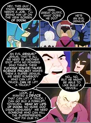 ![]() Why was he even on the team? He was just a less dressed version of Lex Luthor with some buttons pasted to his head. Isn't their evil genius position filled? Buy a laptop, Legion of Doom. Don't dress up a computer in knee socks, bloomers, and a golf shirt. Plus, Brainiac is what stupid children call smart kids when they don't have more distinguishing flaws like smelling like pee or eating things they find in their nose. Even with that wuss Toyman on your team, you're really demeaning yourself now. The Super Friends were always hiring unqualified people. Hawkman, Hawkgirl, and Robin were all just crappier versions of superheroes that already worked for them. But they're good guys. You can understand them hiring their cousin superheroes as favors or letting people in for public relations. The Legion of Doom shouldn't care about shit like that. It seems weird they're spending their mornings enslaving and murdering innocent people and then coming home to make sure all their idiot friends have jobs. ![]() If there's one thing we should have learned by now, it's that robots are only walking encyclopedias. You can teach them to serve drinks or do your homework, and they'll have sex with you for a can of oil and a bottle of turtle wax, but they'll never beat you in a fight. All it takes is a hug and they explode. Their computer brains can never truly understand that it's our feelings that make us special. What good are all the deadly super devices in the world if you can't understand the joy of a puppy's unconditional love, Brainiac? ![]()